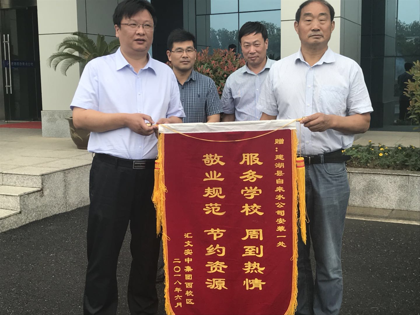 6月19日下午,汇文实验中学西校区领导将一面写有“服务学校 周到热情 敬业规范 节约资源”的锦旗送到公司领导手里,感谢公司工作人员的周到热情服务。